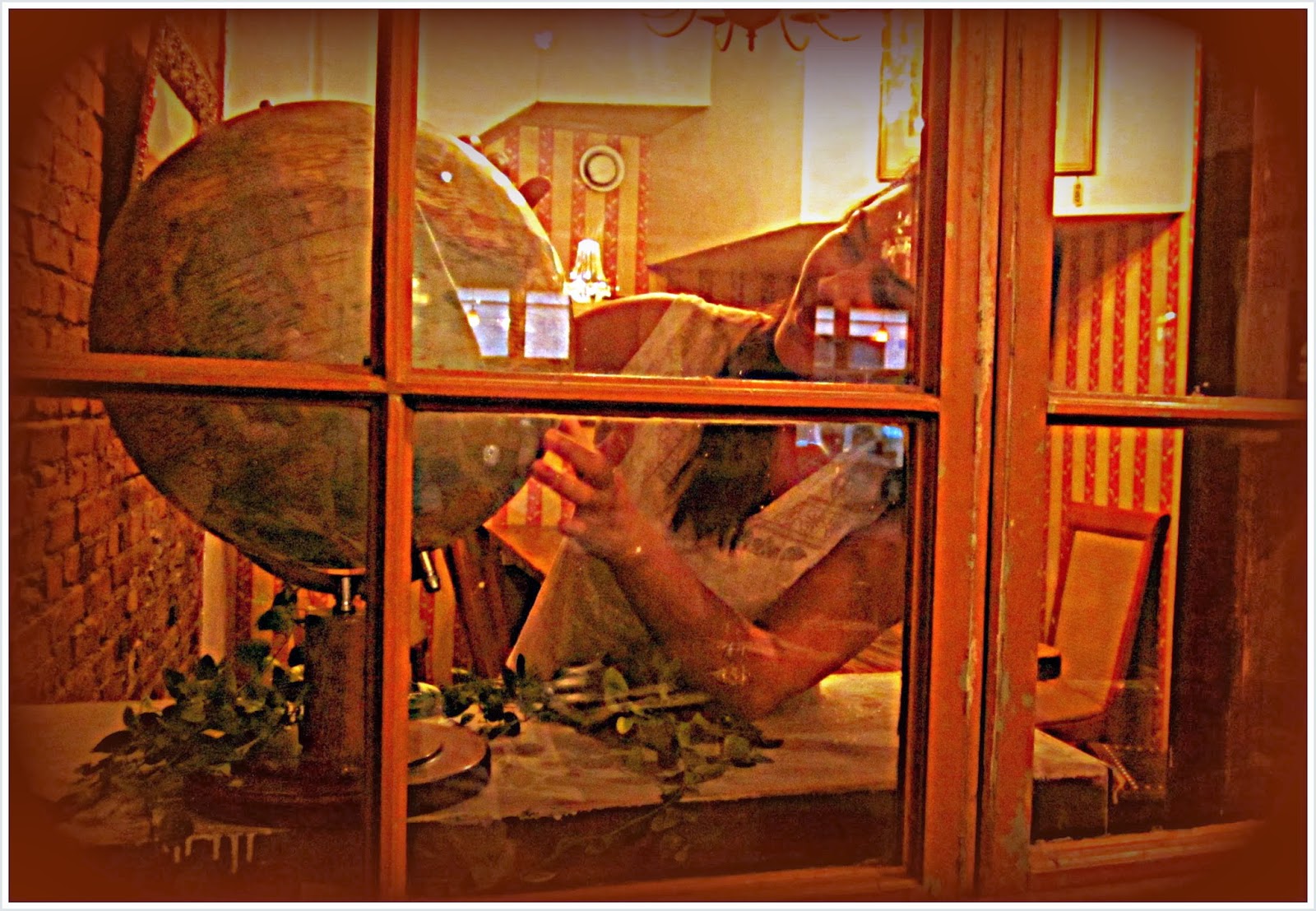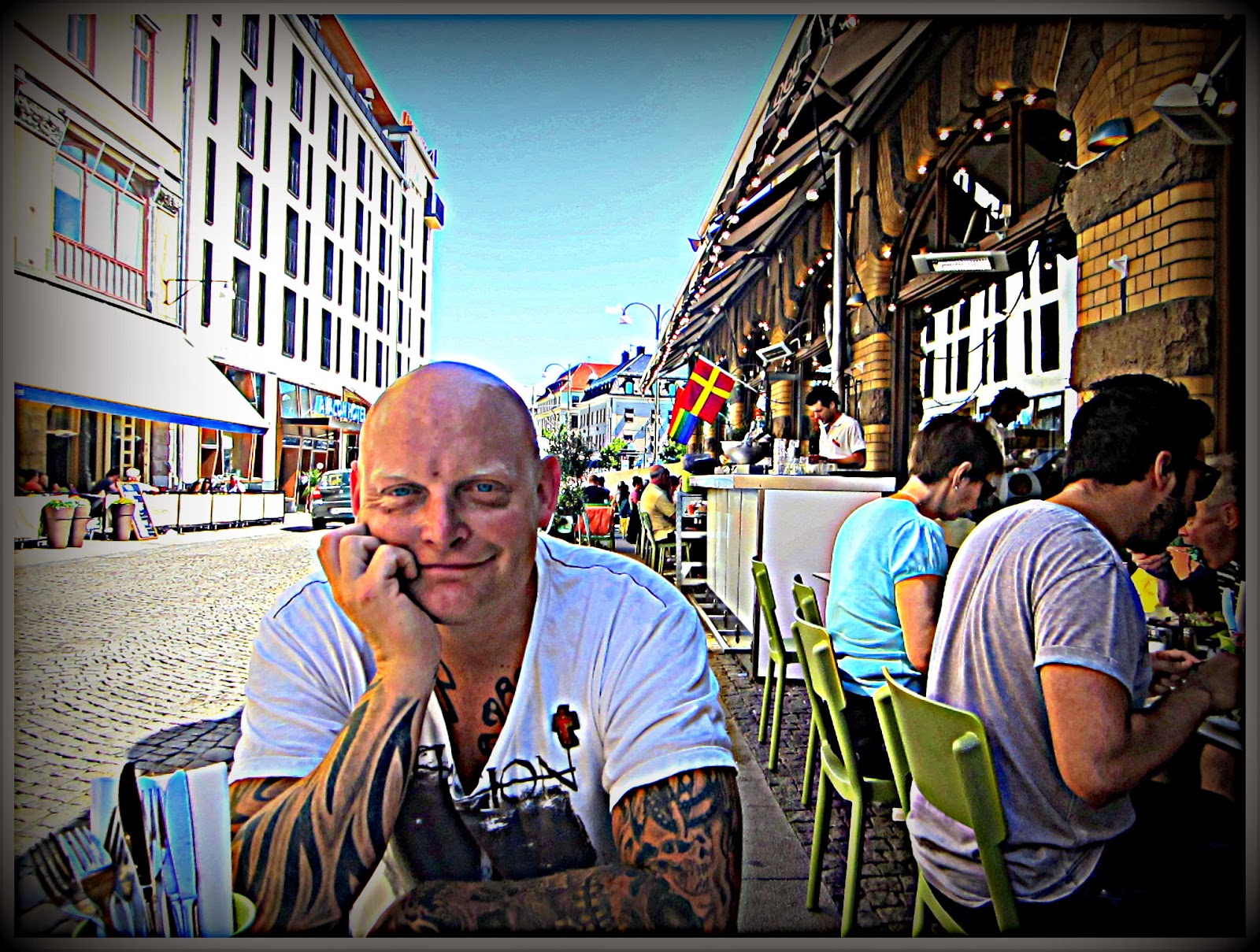 We sit in a small restaurant/bar in the central square of Gothenburg.